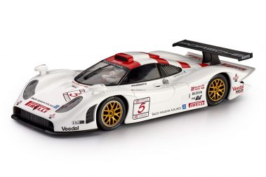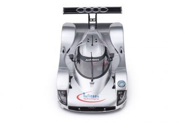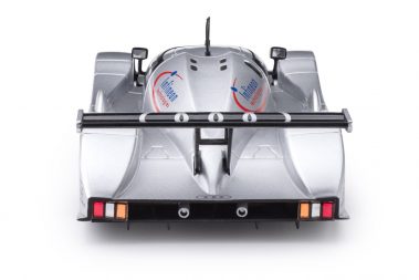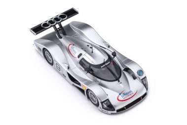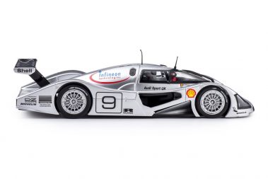 The Audi R8C, designed by Peter Ellerey and Tony Southgate, only took part in the 1999 edition of the 24h of Le Mans. It is still probably one of the most beautiful prototypes in Le Mans history. Unfortunately, its performance did not match its elegance, mostly for lack of development time. Racing Technologies Norfolk built a carbon fibre bodywork around a monocoque frame, all powered with a 358 cc V8 biturbo engine. James Weaver said that the R8C, at one time during the race, had become one of the best cars he had ever driven. None of the two competing R8Cs was able to reach the end of the race. In the following years, Audi opted for an open cockpit version of the R8 and the R8C became the basis for the Bentley Exp Speed 8 project, which won the Le Mans 24 Hours in 2003. This model reproduces the “presentation” car in which the two sides differ in race number and driver’s name. Note that the model also correctly reproduces the shape of the trilobate air intake on the nose, replaced in the race version by a single gap intake.